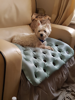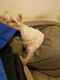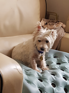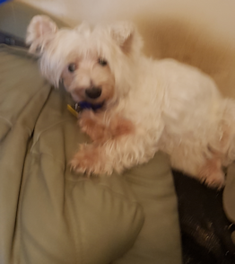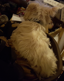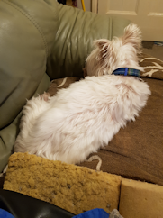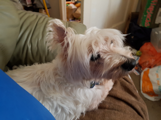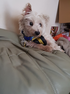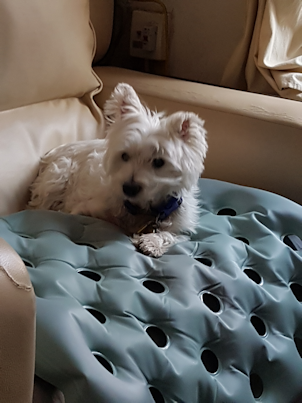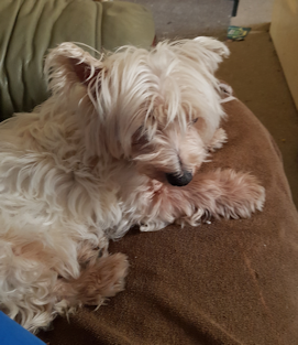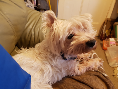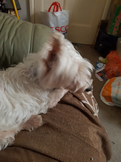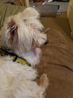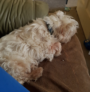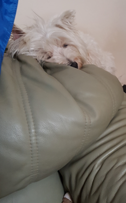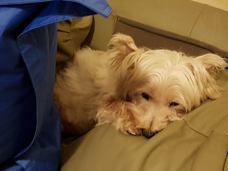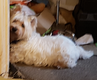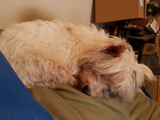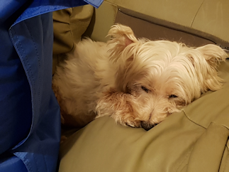 This is a photo of the puppy fast asleep on the back of the sofa this morning (29th June 2019), bless her little heart!