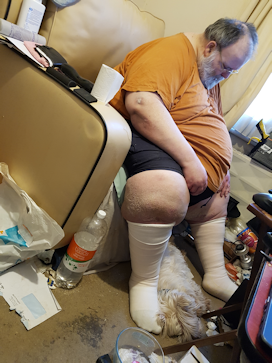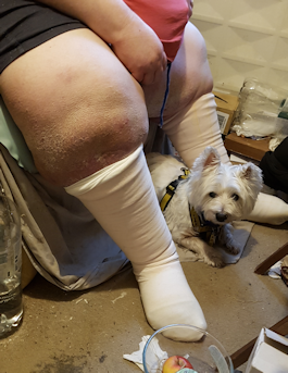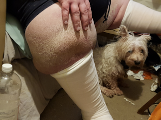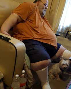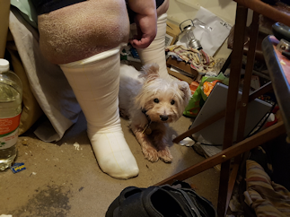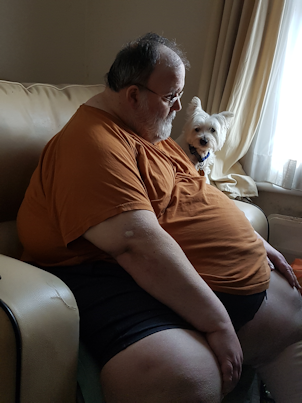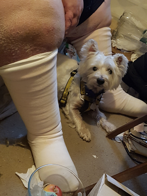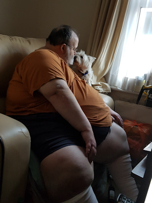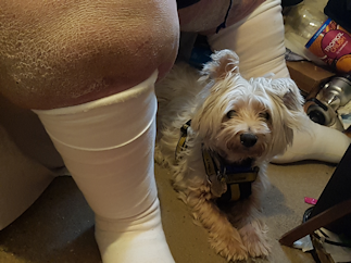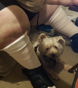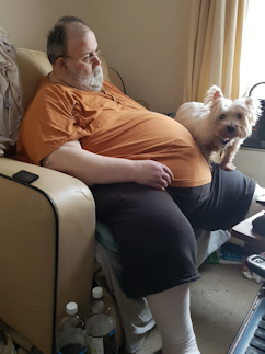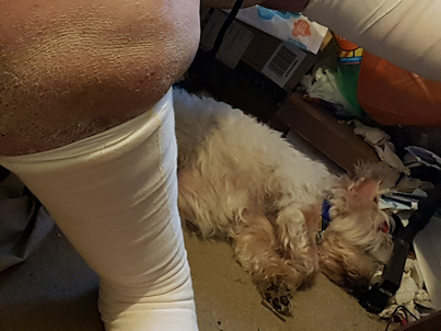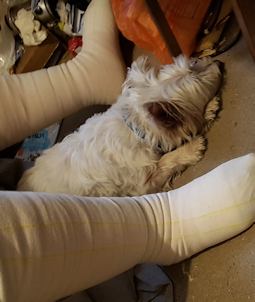 Mornin' all. It's 8th December and I've got a quick photo of the puppy fast asleep between Steve's legs again lol: