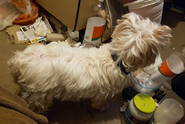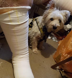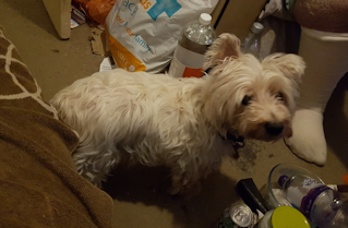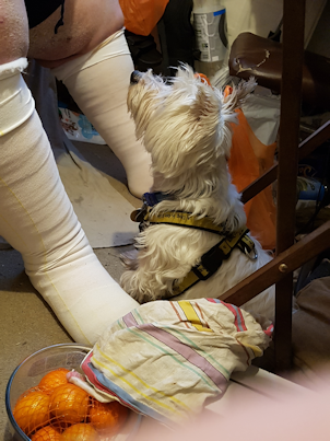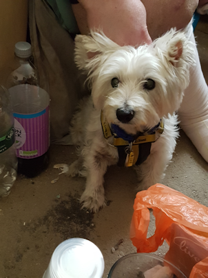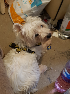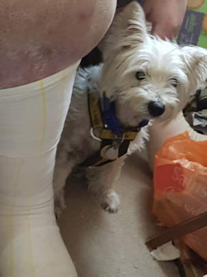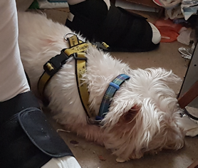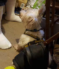 The puppy is in her harness so all ready to rock and roll as soon as she comes to be picked up again