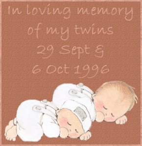This was the very first gift I made in memory of my twins. At the time I made it I didn't have anything I could use to remember my twins as individual children but when I first saw this piece of angel clipart it touched me and it's meant something special ever since - it helped me to remember my children before I had anything else and it will always be a very special piece of clipart for me.